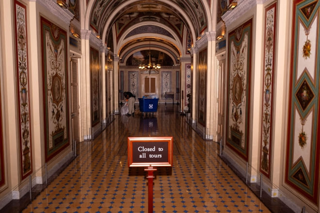 셧다운에 멈춰 선 美의사당 - 미국 연방정부가 1일부터 ‘셧다운’(일시적 업무정지)에 돌입한 가운데 이날 새벽 워싱턴DC 미 의회 의사당 복도 중앙에 ‘관람 중단’ 안내판이 세워져 있다. 미 상원이 전날 예산안 처리에 실패함에 따라 7년만에 다시 연방정부가 멈춰섰다. 미 의회예산국(CBO)은 이번 사태로 75만명의 연방 공무원이 무급휴직에 들어가고, 하루 4억 달러(약 5600억원) 규모의 경제 손실이 발생할 것으로 예상했다. 워싱턴DC AFP 연합뉴스
