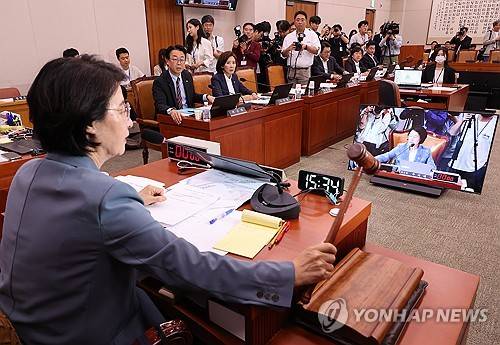 정부조직법 與주도 법사위 통과…검찰청 폐지·기재부 개편 (서울=연합뉴스) 박동주 기자 = 24일 서울 여의도 국회에서 열린 법제사법위원회 전체회의에서 더불어민주당 소속 추미애 위원장이 정회를 선언하고 있다
